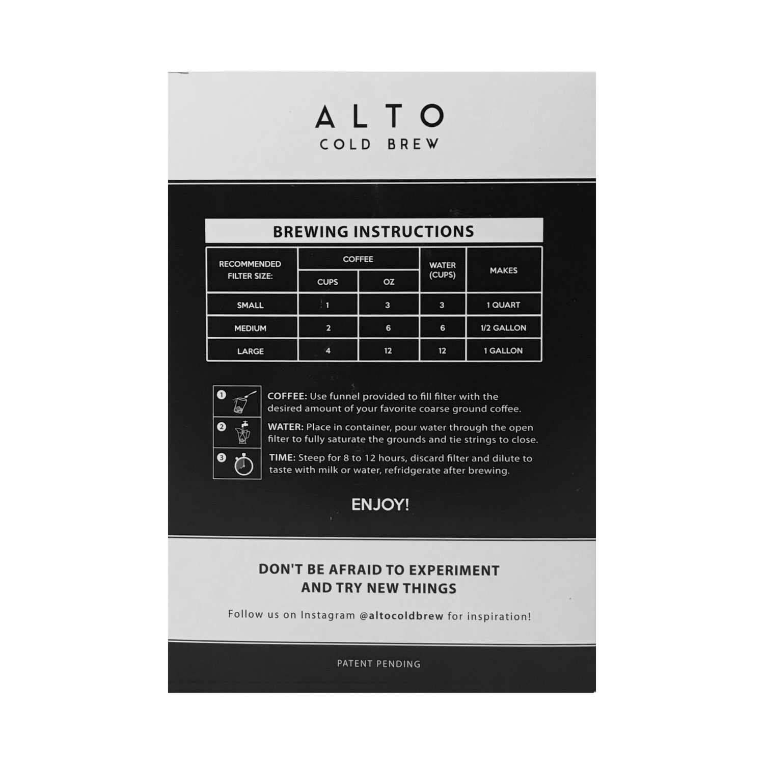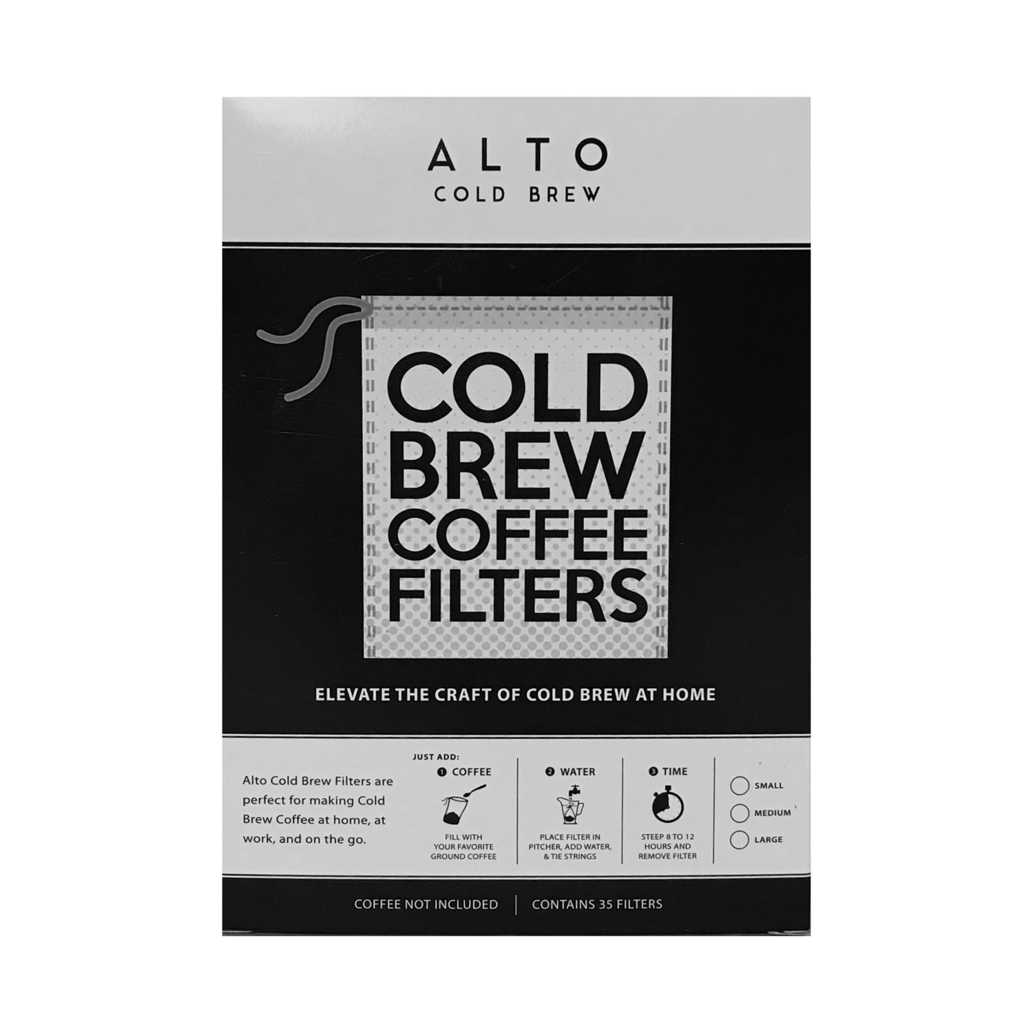 Each pack contains 35 small (4" x 8") disposable filters with cotton drawstring. These are the filters we use to make cold brew in our cafes. We recommend our Espresso Blend for cold brew.